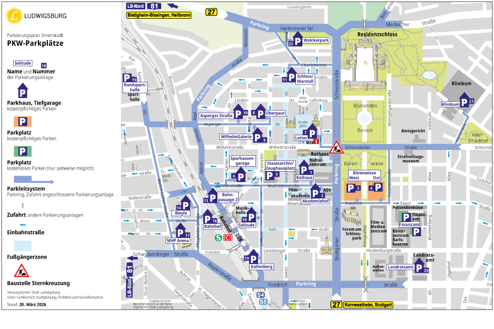 Das Blühende Barock erreichen Sie bequem über die A81 (Ausfahrt Ludwigsburg-Süd) oder die B27. Folgen Sie der Beschilderung Richtung Residenzschloss/Blühendes Barock. Parkmöglichkeiten finden Sie in unmittelbarer Nähe. Nutzen Sie bitte das Parkleitsystem der Stadt Ludwigsburg.